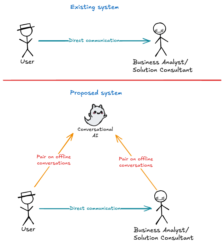 Since most teams are distributed, a conversational AI can help users prepare for their synchronous or asynchronous communication with the team given that the AI has the persona of a developer who is an expert at the specific tech that is used to work on the product. Similarly, delivery team members can use a conversational AI system to help understand the business context better and anticipate pushback and prep for it. Being able to understand the devil’s advocate stance in their head and prepare for it is something most people struggle with. Important conversations still happen through direct communication, however, both the users and the business analysts can help pair on preparing for the actual conversation with real people on the other side.