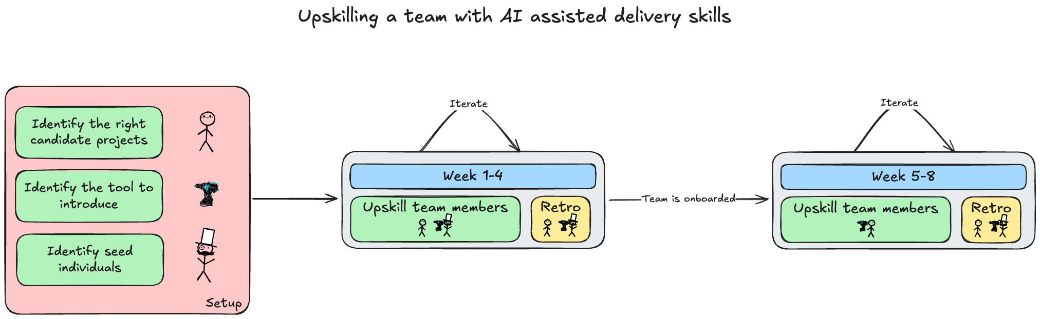- Set up time to up-skill team members (on the skills from the “For people on teams” section). Pair team members with seed individuals for maximum effectiveness.